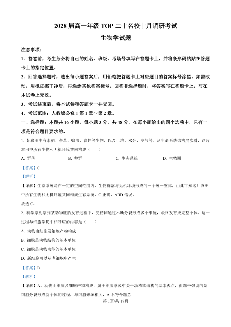 高一生物(精品解析版)--河南省TOP二十名校2025-2026学年高一上学期10月调研考试
