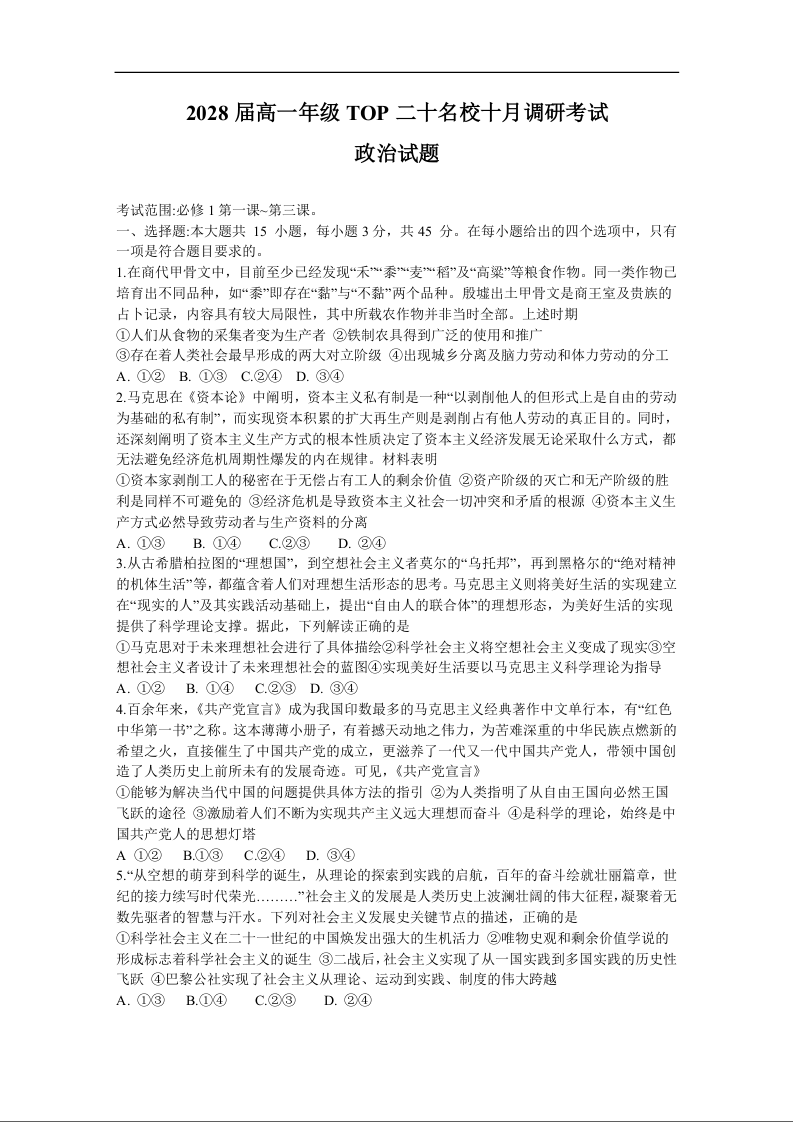 高一政治--河南省TOP二十名校2025-2026学年高一上学期10月调研考试