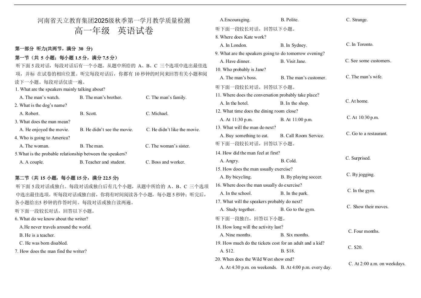 高一英语--河南省天立教育集团2025-2026学年高一上学期10月联考