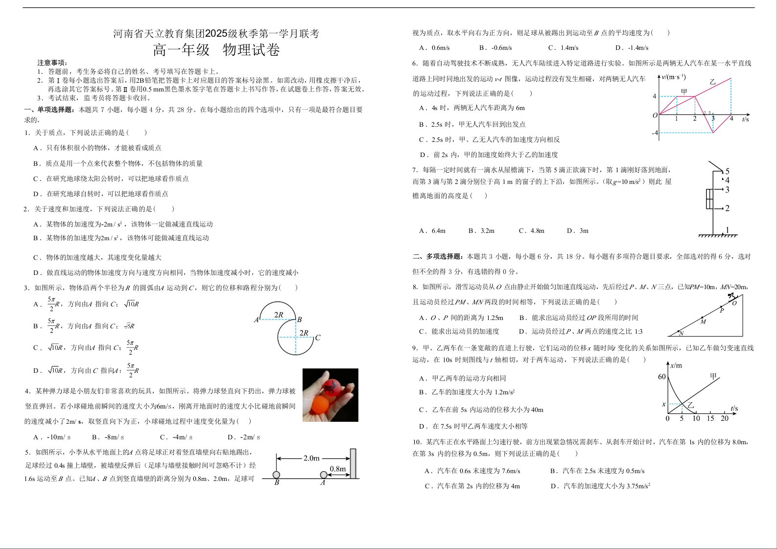 高一物理--河南省天立教育集团2025-2026学年高一上学期10月联考