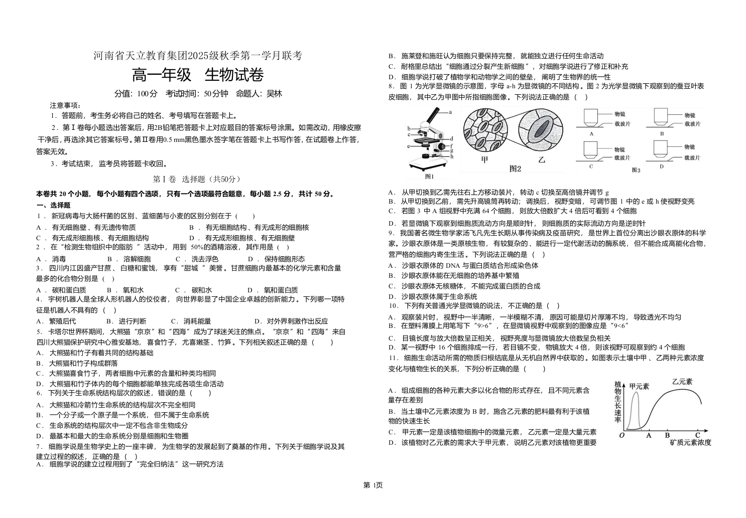 高一生物--河南省天立教育集团2025-2026学年高一上学期10月联考