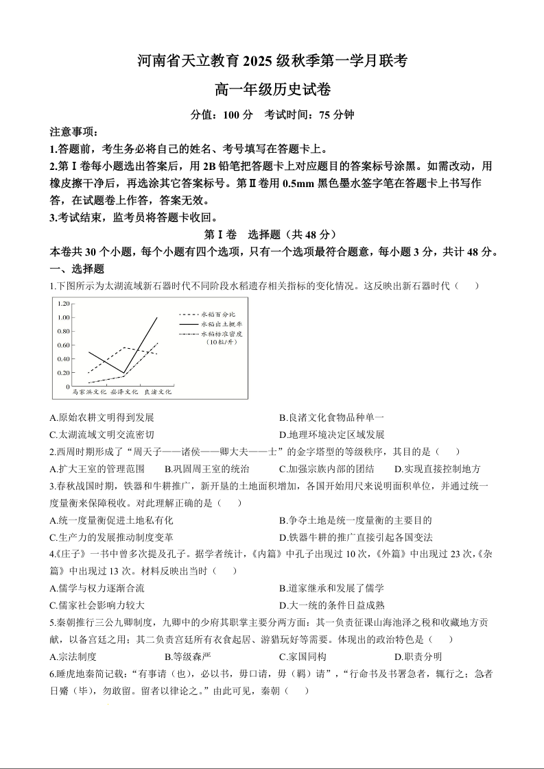 高一历史+答案--河南省天立教育集团2025-2026学年高一上学期10月联考