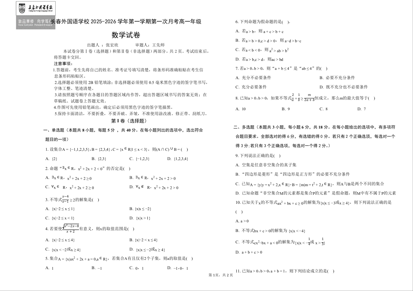 高一数学+答案--吉林省长春外国语学校2025-2026学年高一上学期10月第一次月考