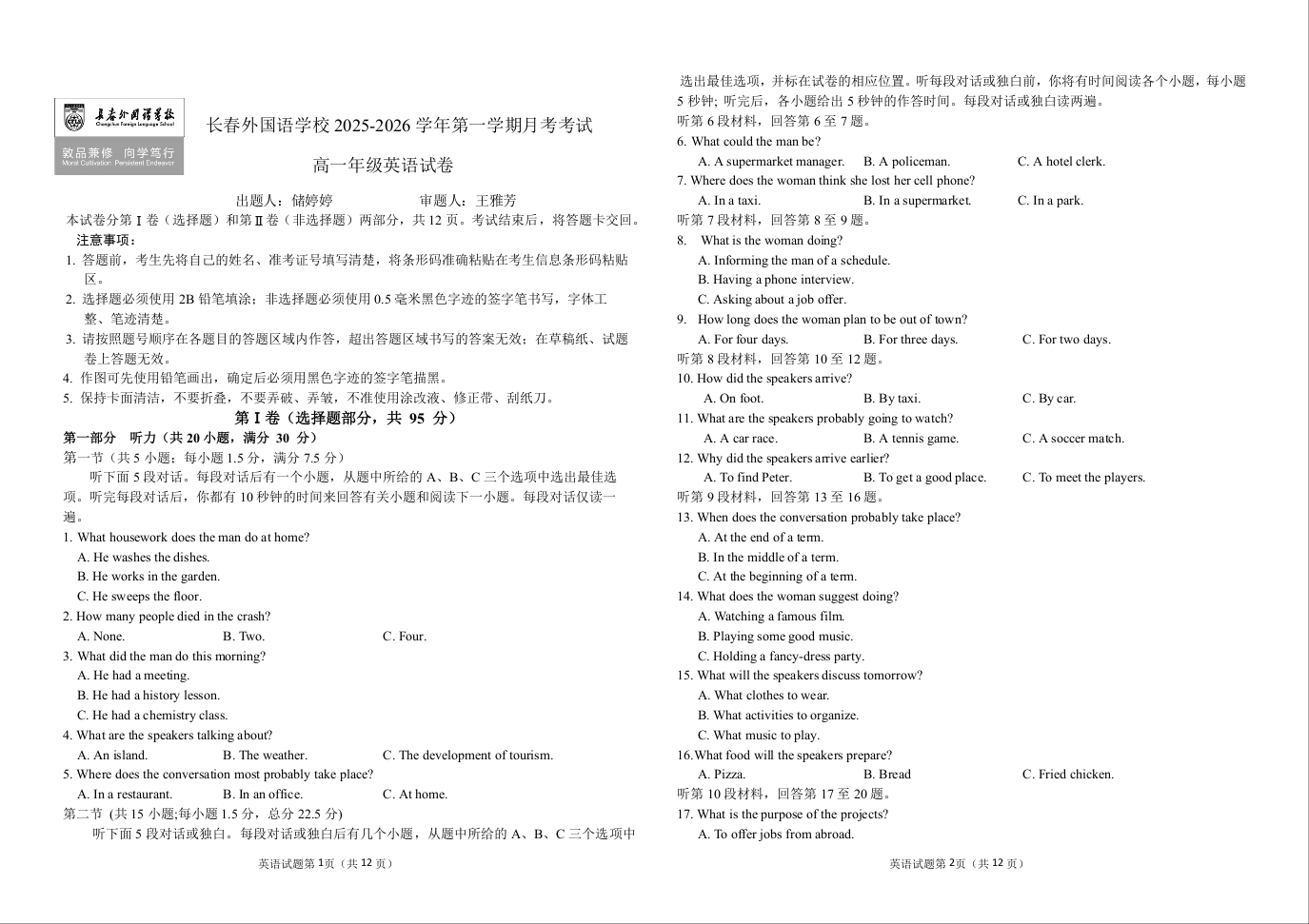 高一英语+答案--吉林省长春外国语学校2025-2026学年高一上学期10月第一次月考