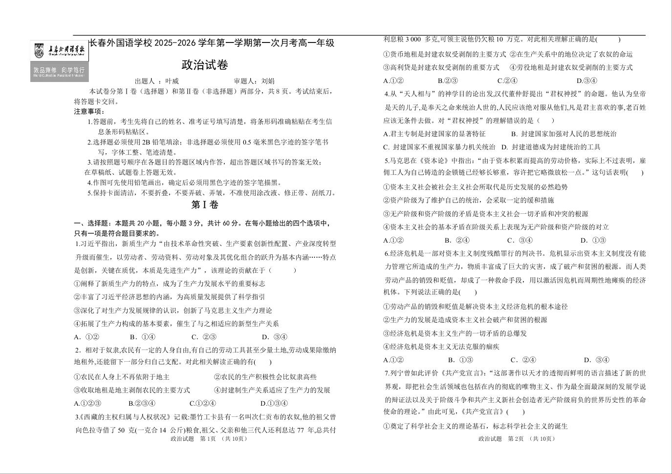 高一政治+答案--吉林省长春外国语学校2025-2026学年高一上学期10月第一次月考