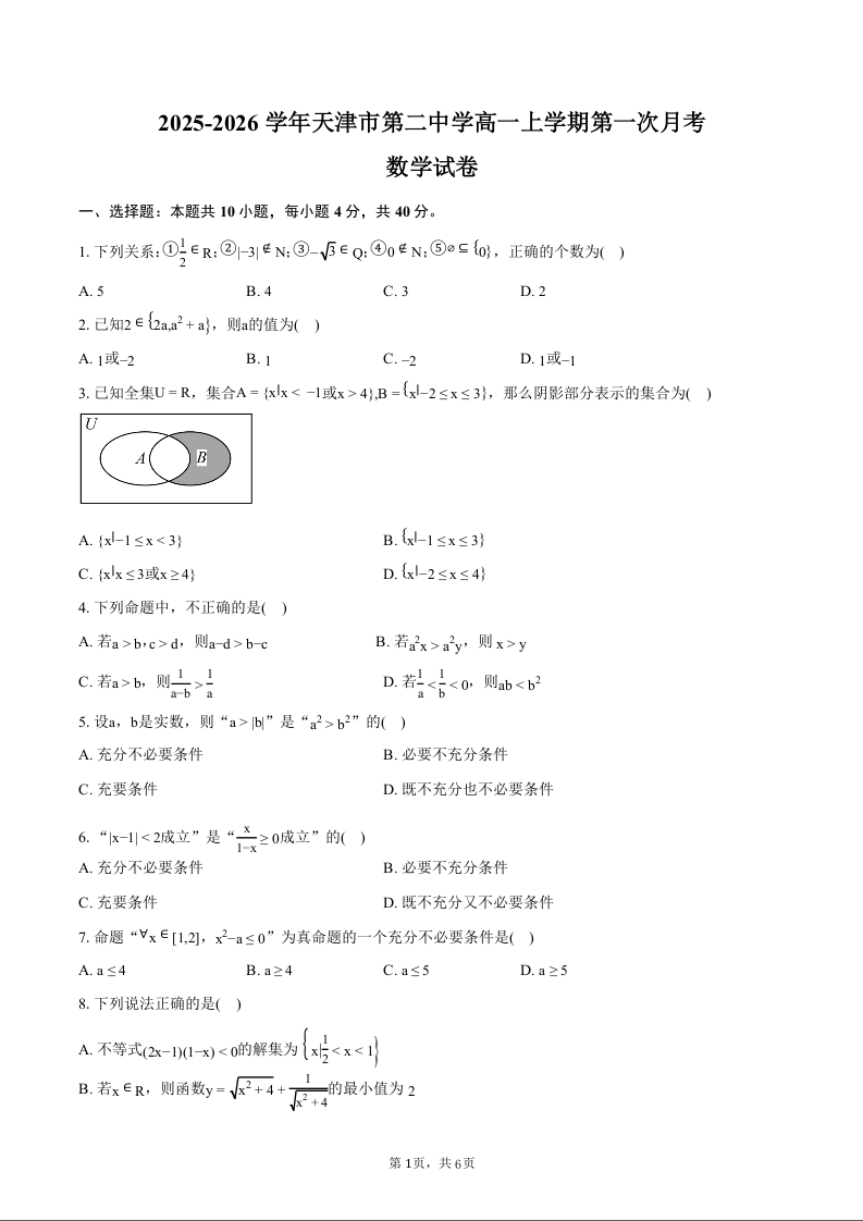 高一数学+答案--天津市第二中学2025-2026学年高一上学期第一次月考