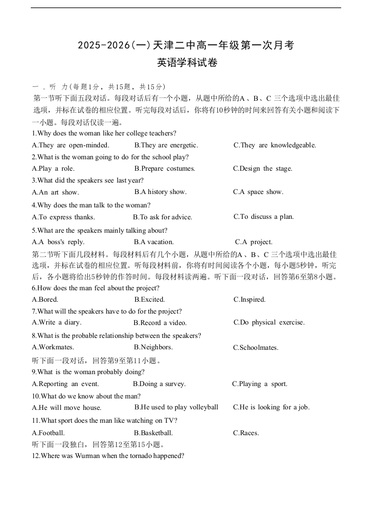 高一英语--天津市第二中学2025-2026学年高一上学期第一次月考