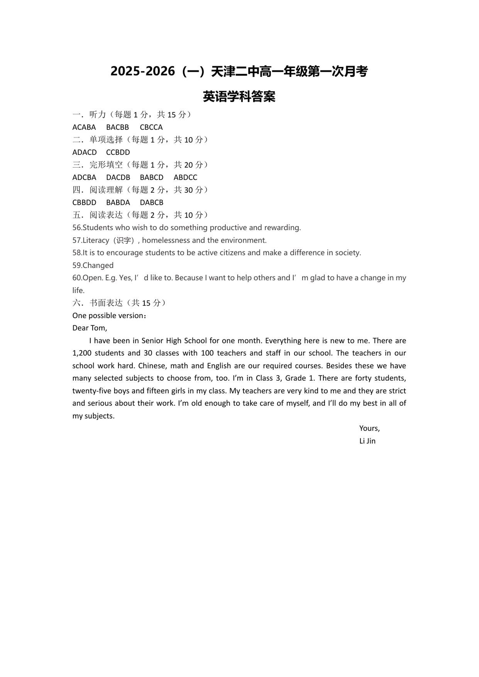 高一英语答案--天津市第二中学2025-2026学年高一上学期第一次月考
