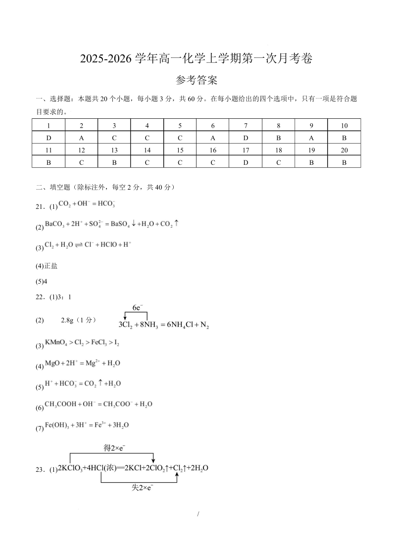 高一化学答案--天津市第二中学2025-2026学年高一上学期第一次月考