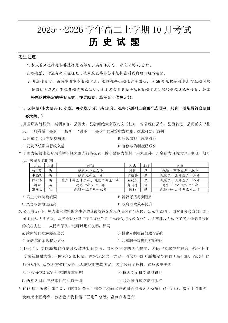 高二历史--河北省保定市八校2025-2026学年高二上学期10月月考