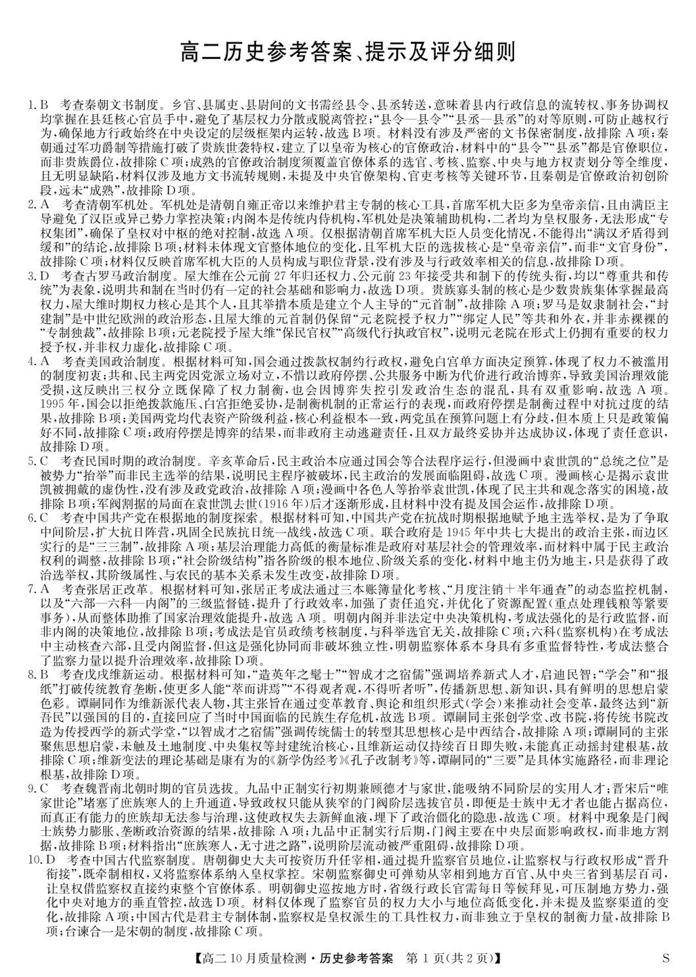 高二历史答案--河北省保定市八校2025-2026学年高二上学期10月月考