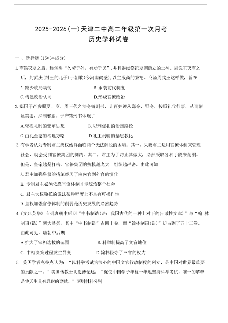 高二历史--天津市第二中学2025-2026学年高二上学期第一次月考