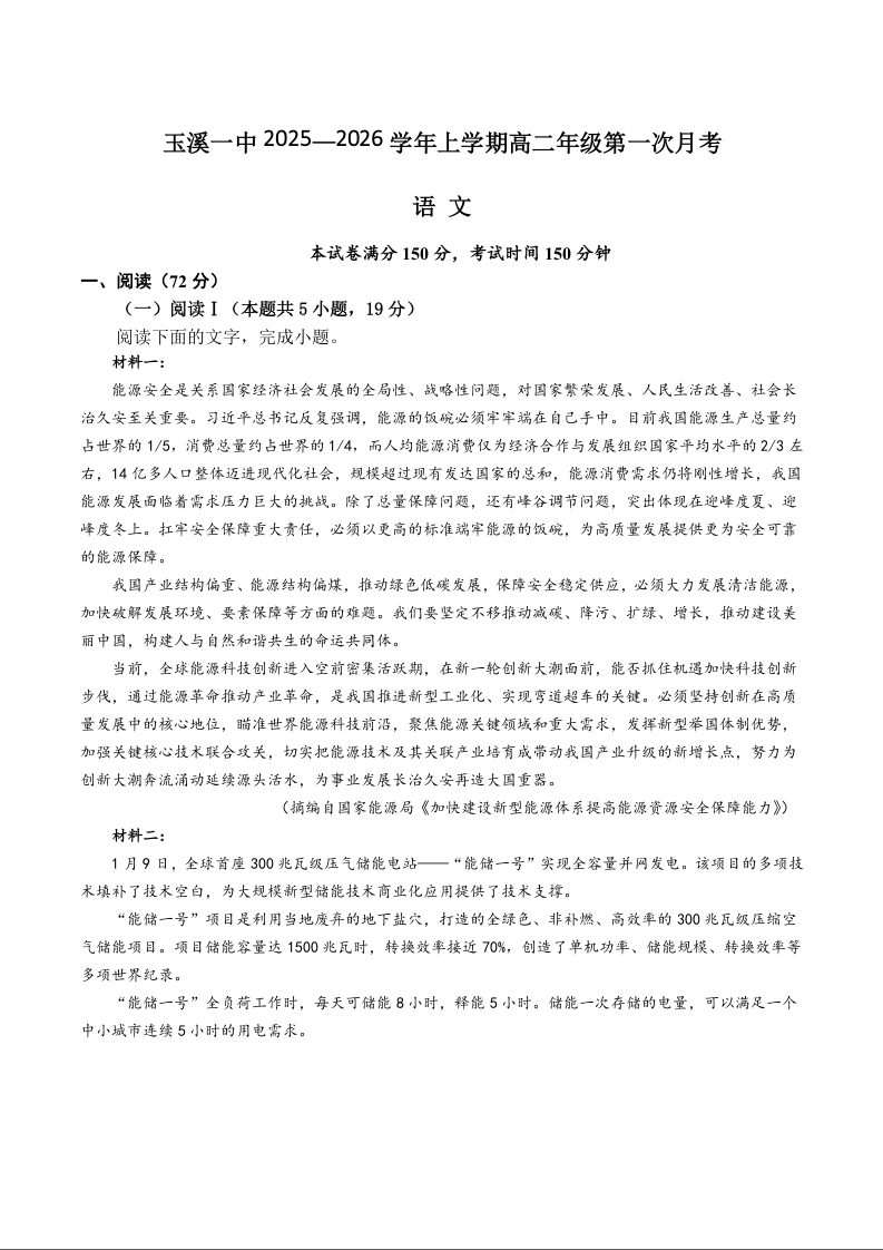 高二语文+答案--云南省玉溪第一中学2025-2026学年高二上学期第一次月考