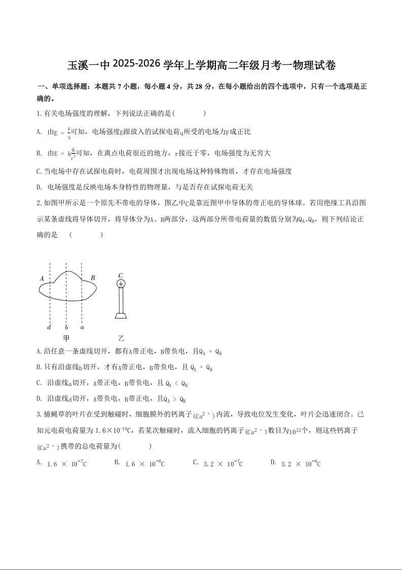 高二物理+答案--云南省玉溪第一中学2025-2026学年高二上学期第一次月考