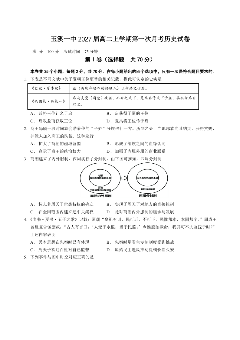 高二历史+答案--云南省玉溪第一中学2025-2026学年高二上学期第一次月考
