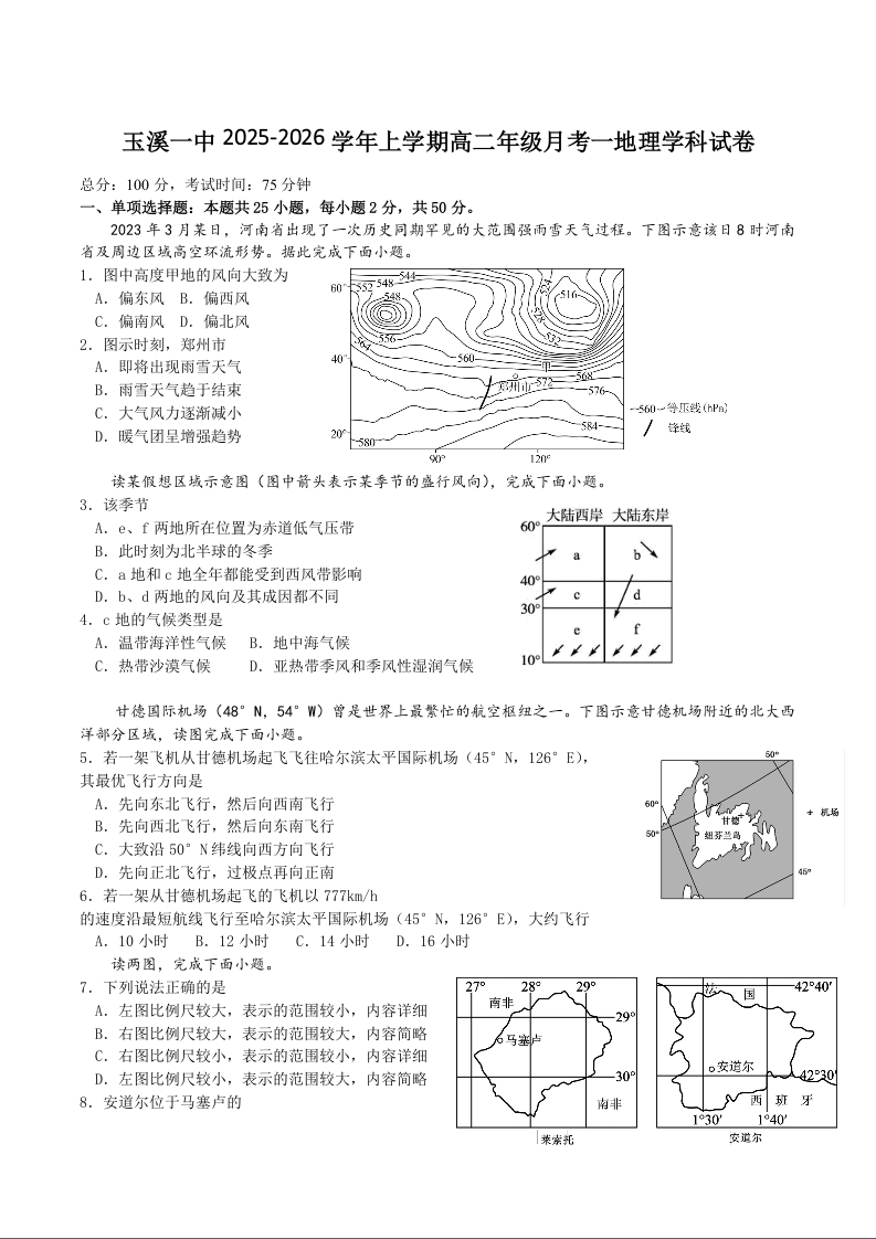 高二地理+答案--云南省玉溪第一中学2025-2026学年高二上学期第一次月考