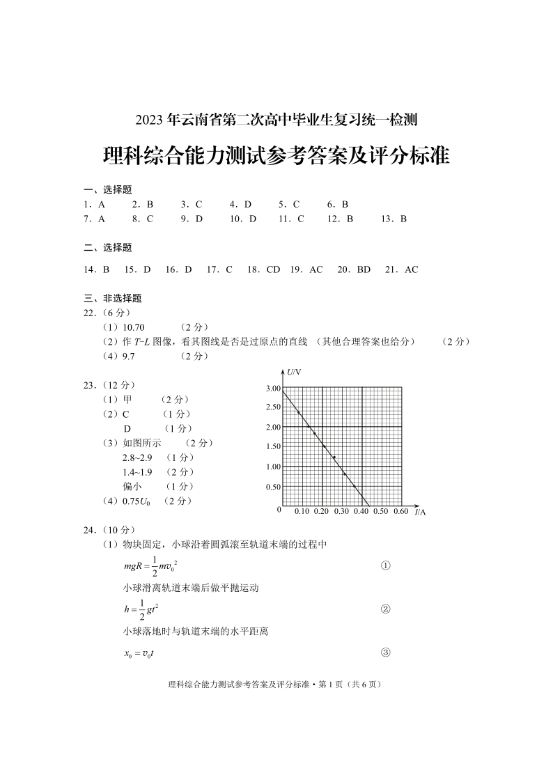 高三理综答案--2023 年云南省第二次高中毕业生复习统一检测(云南统测二)