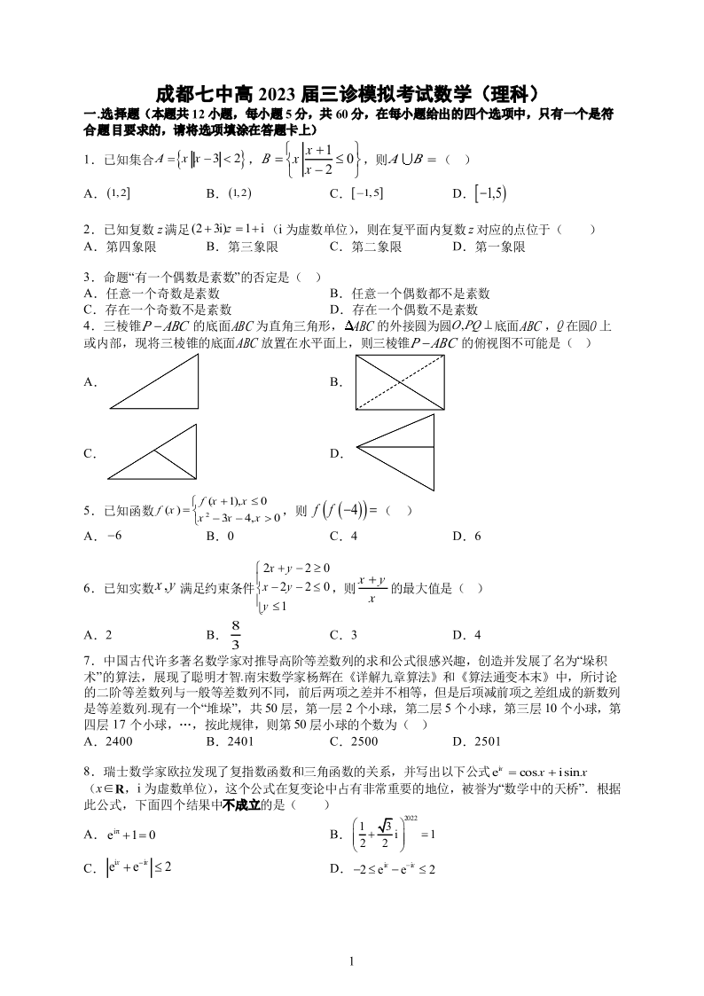 高三理数--四川省成都七中2023届三诊模拟考试