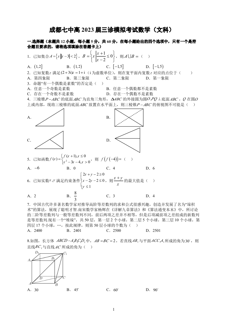 高三文数--四川省成都七中2023届三诊模拟考试