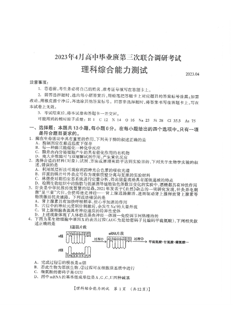 高三理综--广西2023届高中毕业班第三次联合调研考试