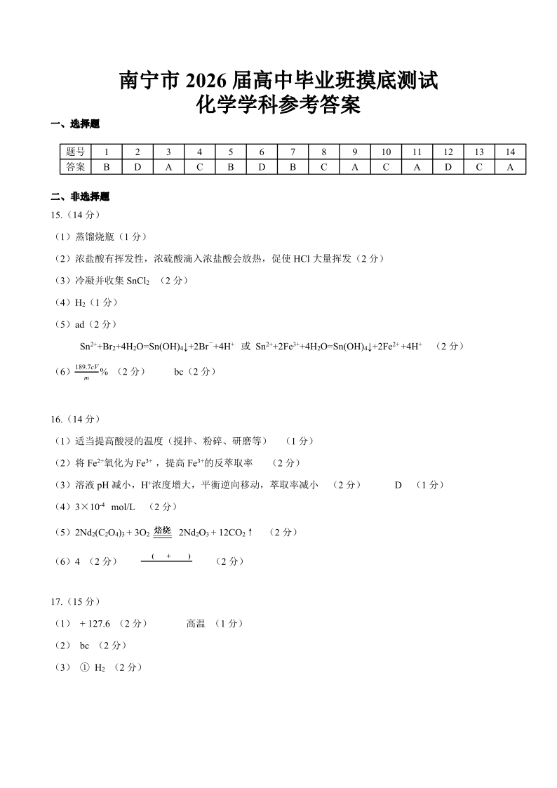 高三化学答案--广西省南宁市2026届高中毕业班10月摸底测试