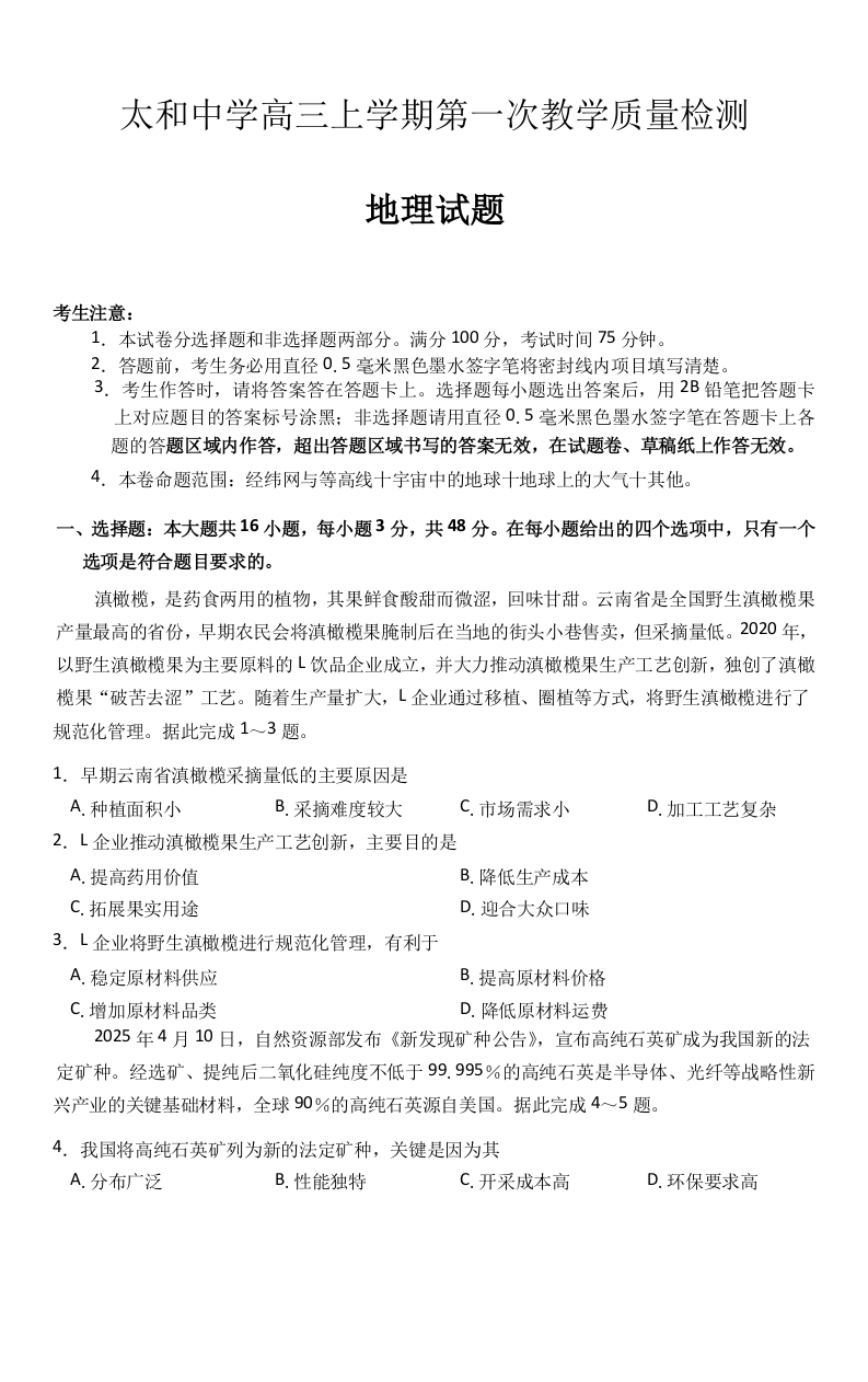 高三地理--安徽省阜阳市太和中学2026届高三上学期10月月考