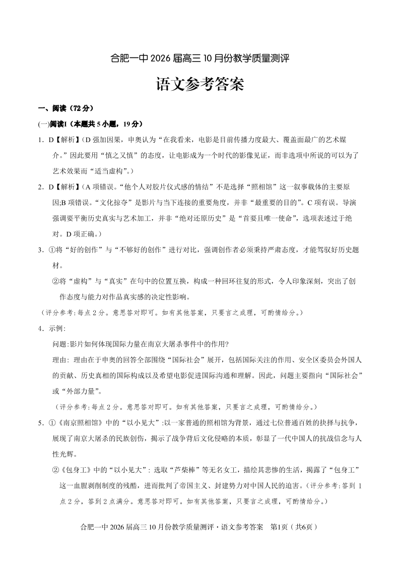 高三语文答案--安徽省合肥一中2026届高三 10 月份教学质量测评