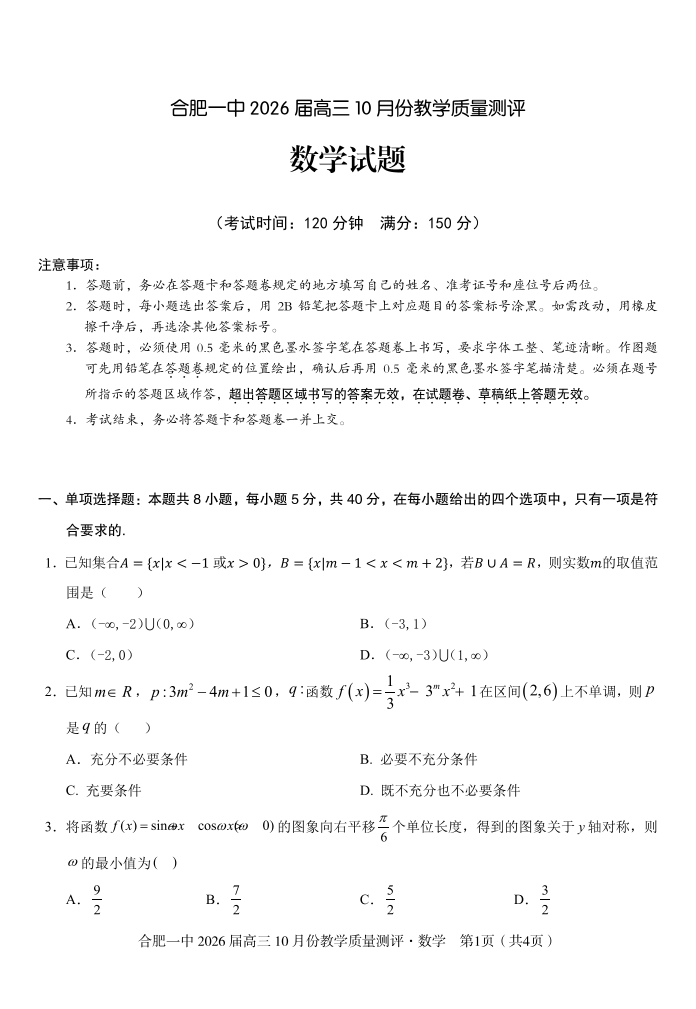 高三数学--安徽省合肥一中2026届高三 10 月份教学质量测评