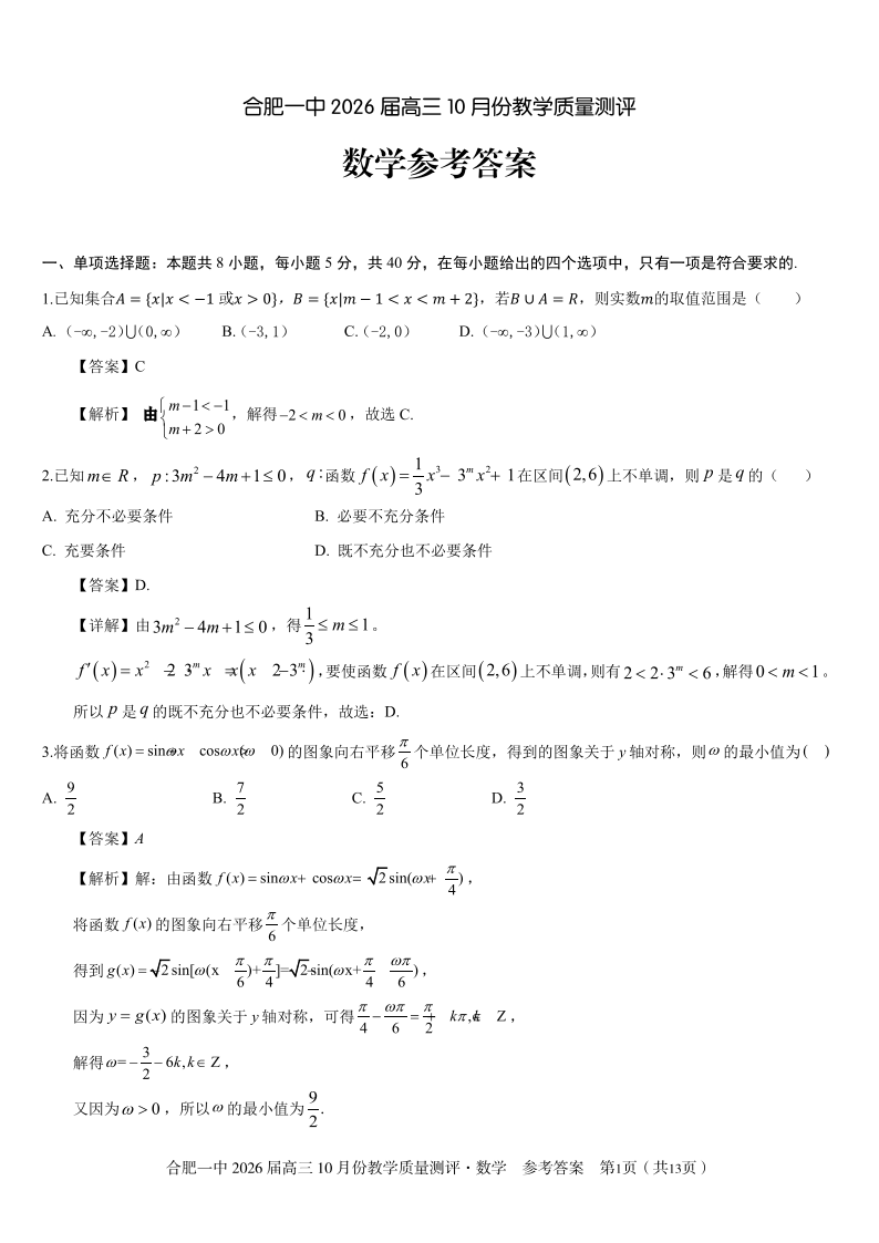 高三数学答案--安徽省合肥一中2026届高三 10 月份教学质量测评