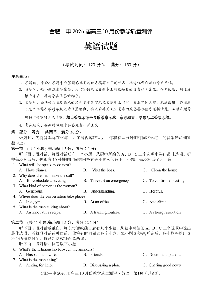 高三英语--安徽省合肥一中2026届高三 10 月份教学质量测评