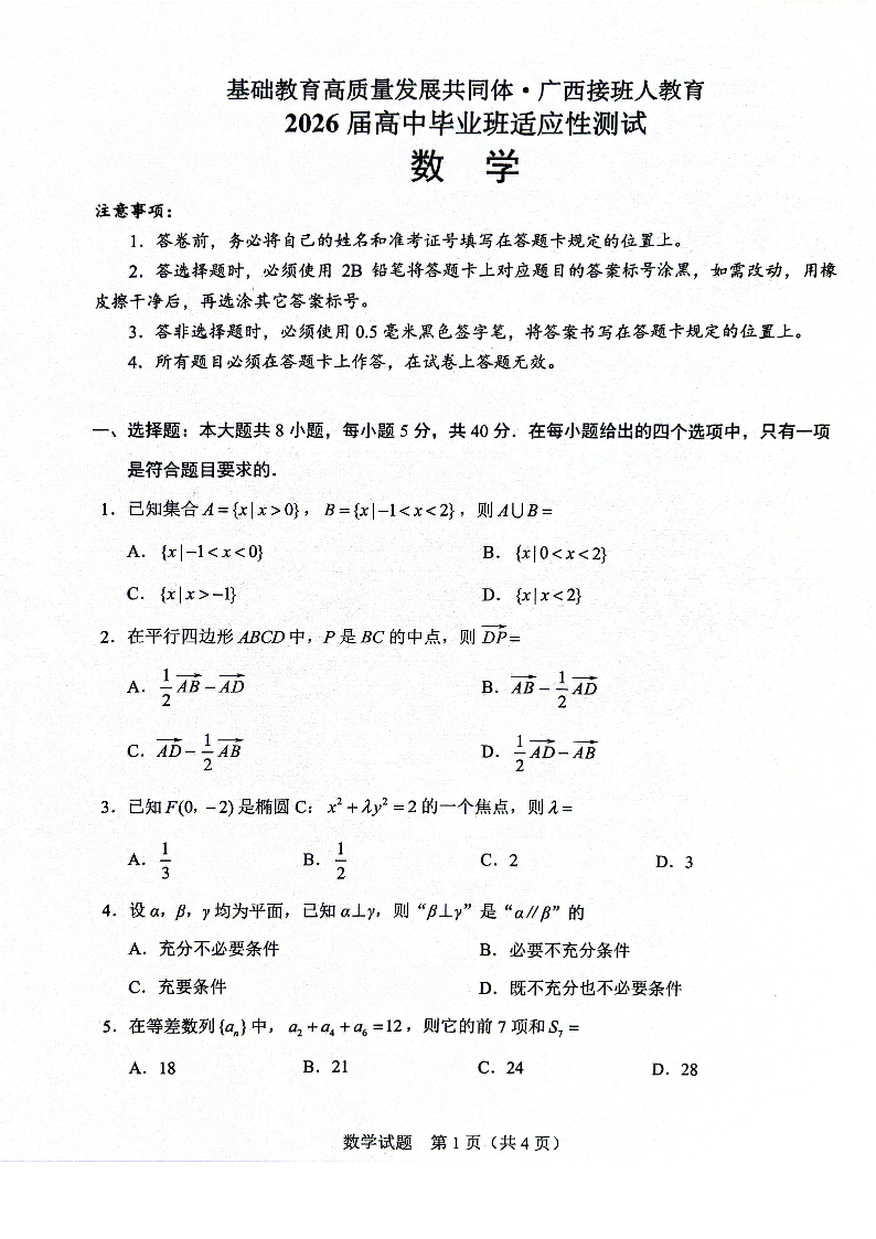 高三数学--广西接班人教育基础教育高质量发展共同体2026 届高中毕业班适应性测试
