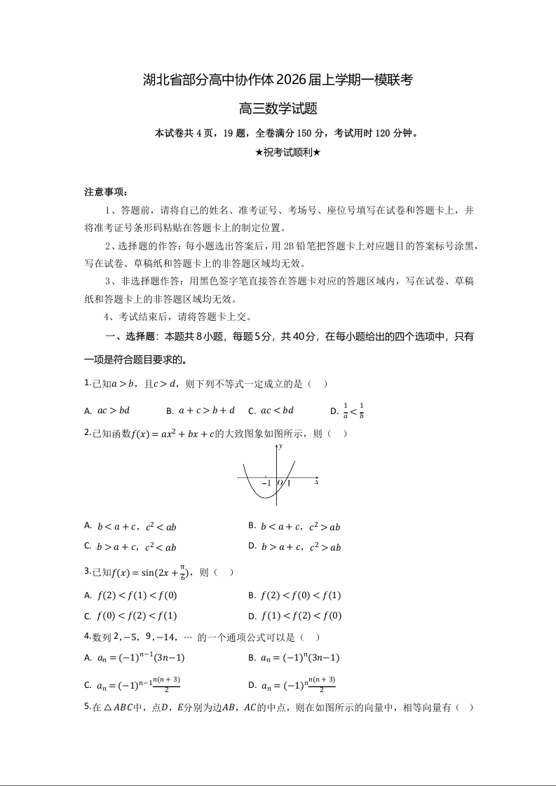 高三数学--湖北省部分高中协作体2026届高三上学期一模联考