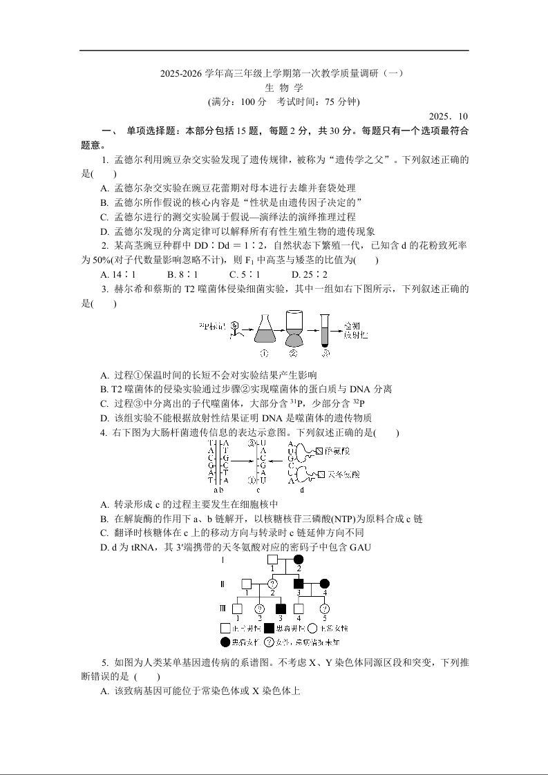 高三生物--江苏省南通市如皋市2026届高三上学期教学质量调研(一)
