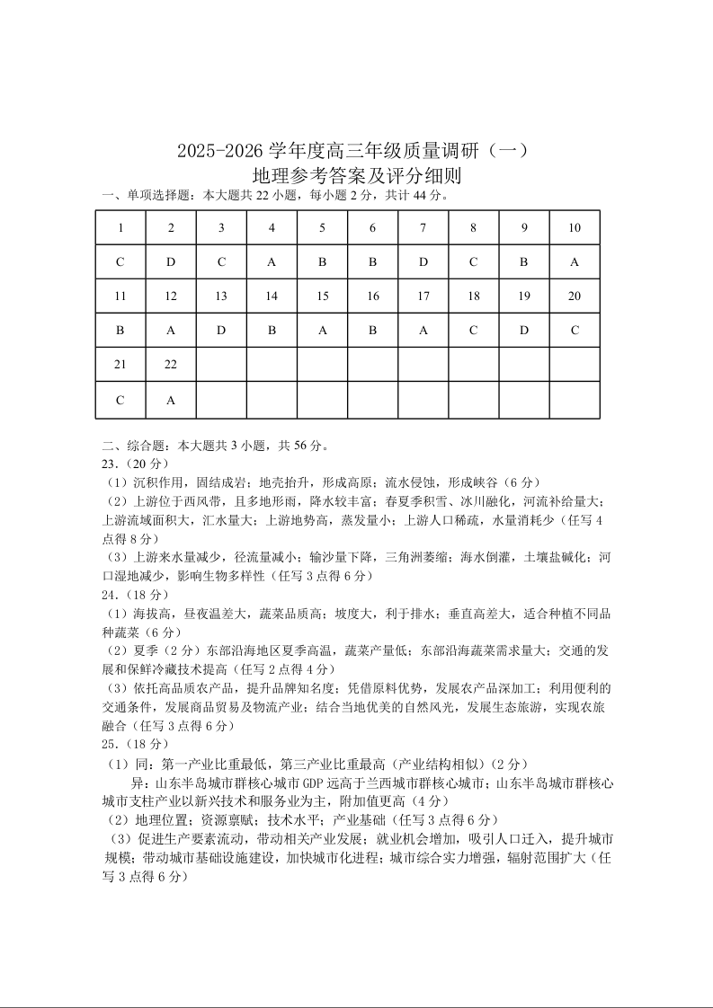 高三地理答案--江苏省南通市如皋市2026届高三上学期教学质量调研(一)