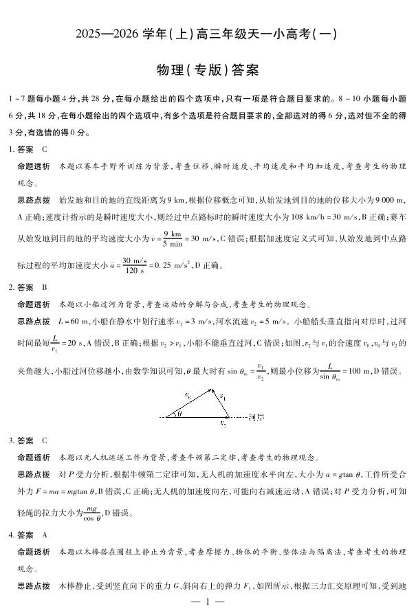 高三物理答案--陕西、山西省2026届高三10月天一小高考(一)