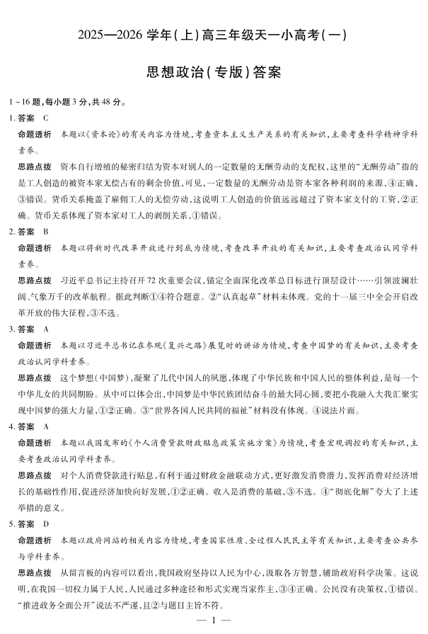 高三政治答案--陕西、山西省2026届高三10月天一小高考(一)
