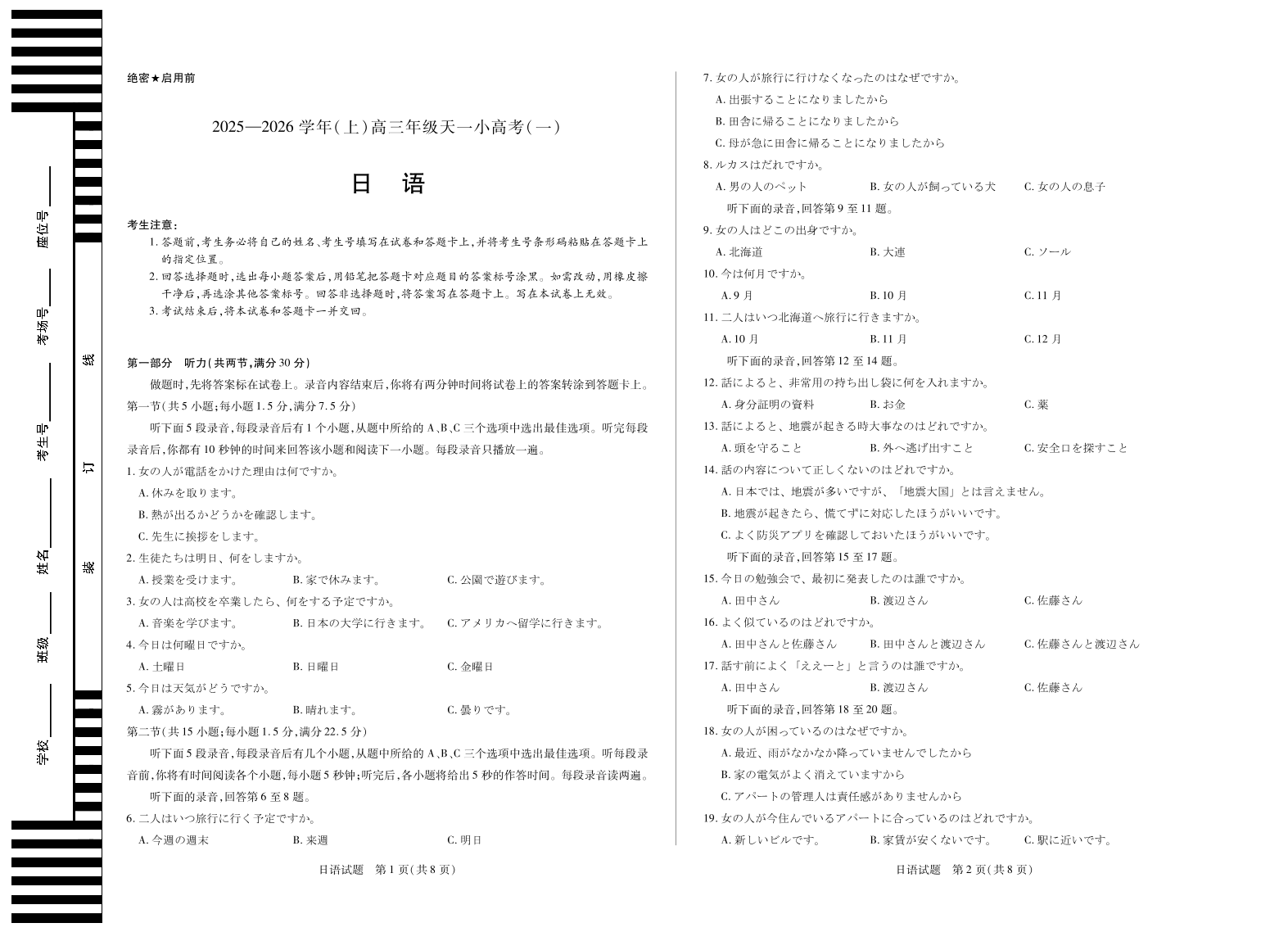 高三日语--陕西、山西省2026届高三10月天一小高考(一)