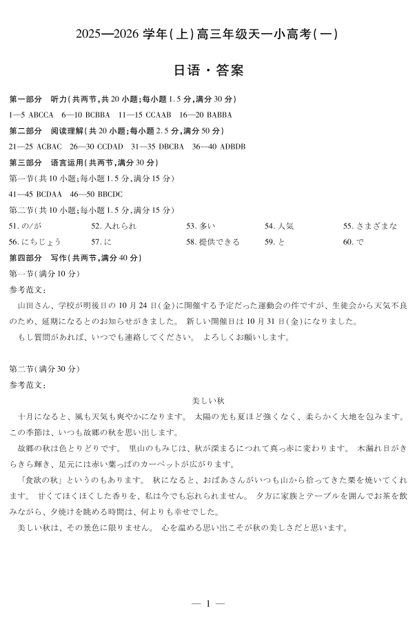 高三日语答案--陕西、山西省2026届高三10月天一小高考(一)