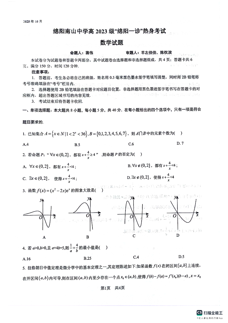 高三数学--四川省绵阳南山中学高2023级“绵阳一诊”热身考试