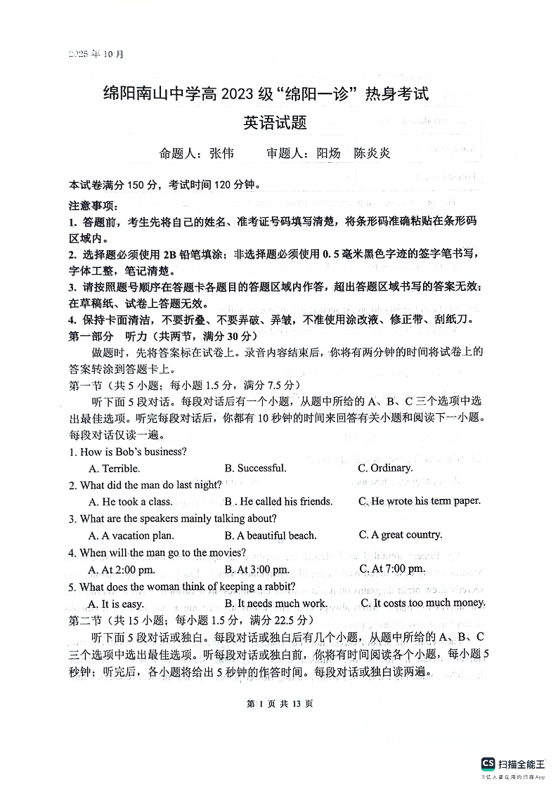 高三英语--四川省绵阳南山中学高2023级“绵阳一诊”热身考试