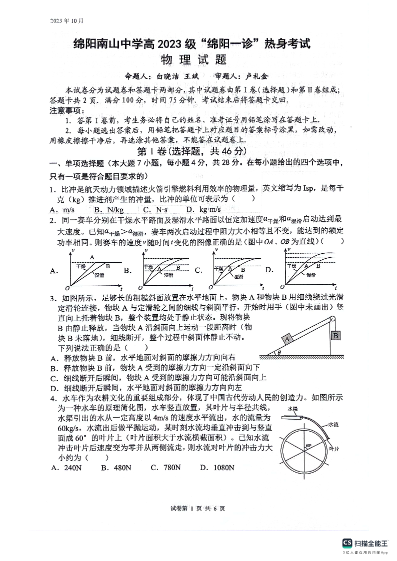 高三物理--四川省绵阳南山中学高2023级“绵阳一诊”热身考试