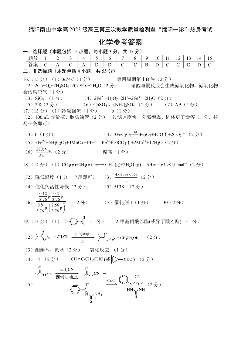高三化学答案--四川省绵阳南山中学高2023级“绵阳一诊”热身考试
