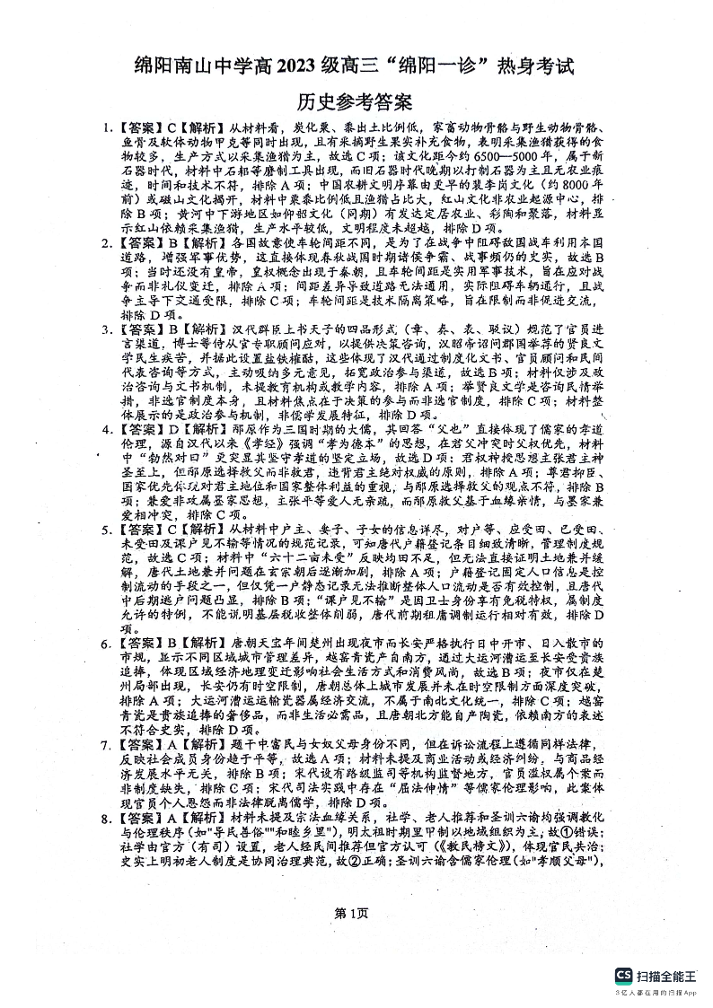 高三历史答案--四川省绵阳南山中学高2023级“绵阳一诊”热身考试