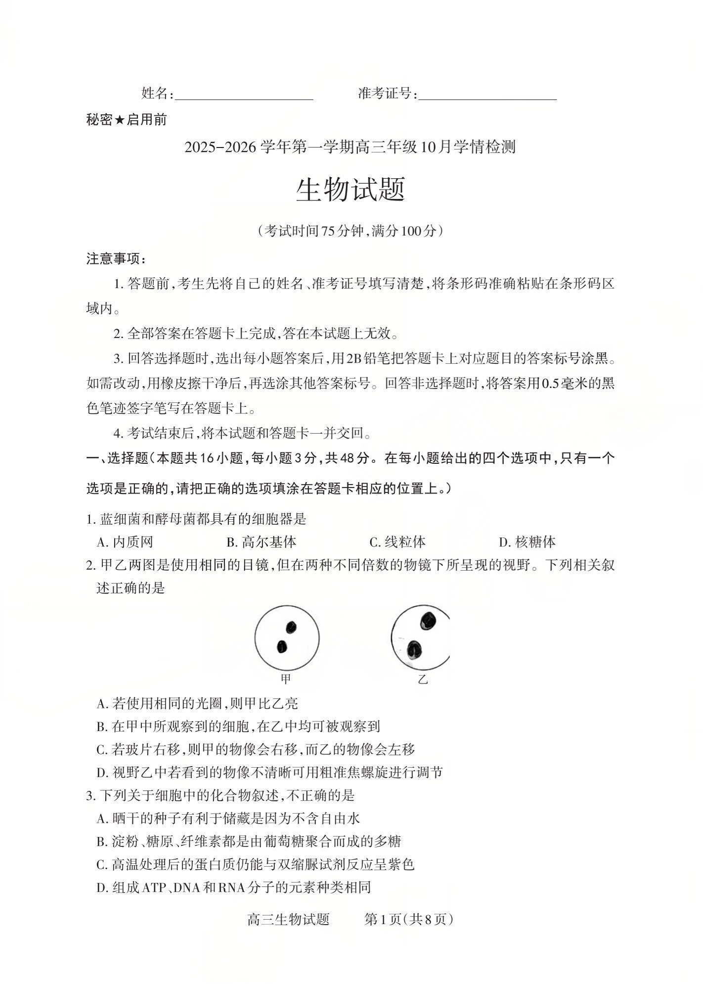 高三生物--山西省三重教育2026届第一学期高三年级10月学情检测