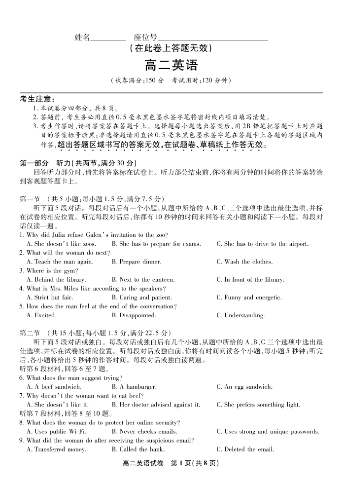 高二英语--安徽省皖江名校联盟2025-2026学年高二上学期10月阶段考