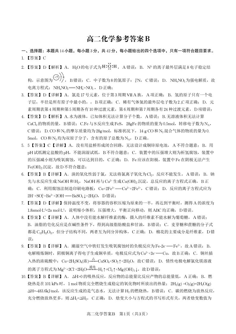 高二化学答案B--安徽省皖江名校联盟2025-2026学年高二上学期10月阶段考