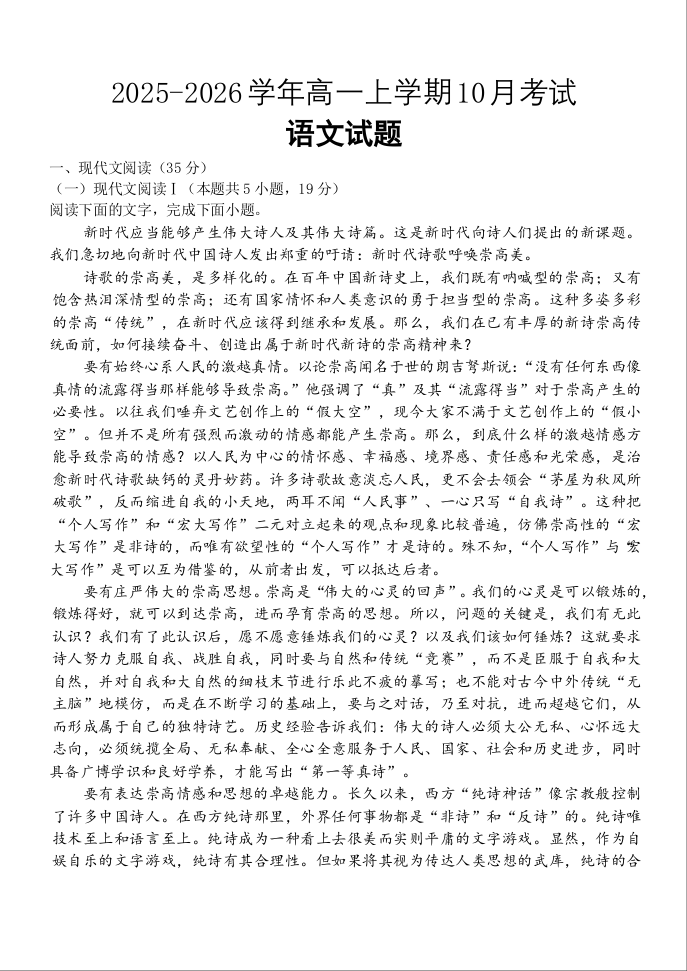 高一语文+答案--河北省保定市唐县第一中学2025-2026学年高一上学期10月月考
