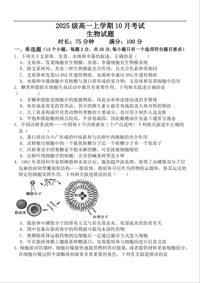 高一生物--河北省保定市唐县第一中学2025-2026学年高一上学期10月月考