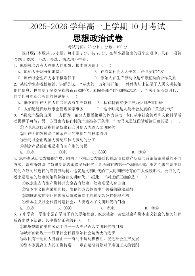 高一政治+答案--河北省保定市唐县第一中学2025-2026学年高一上学期10月月考