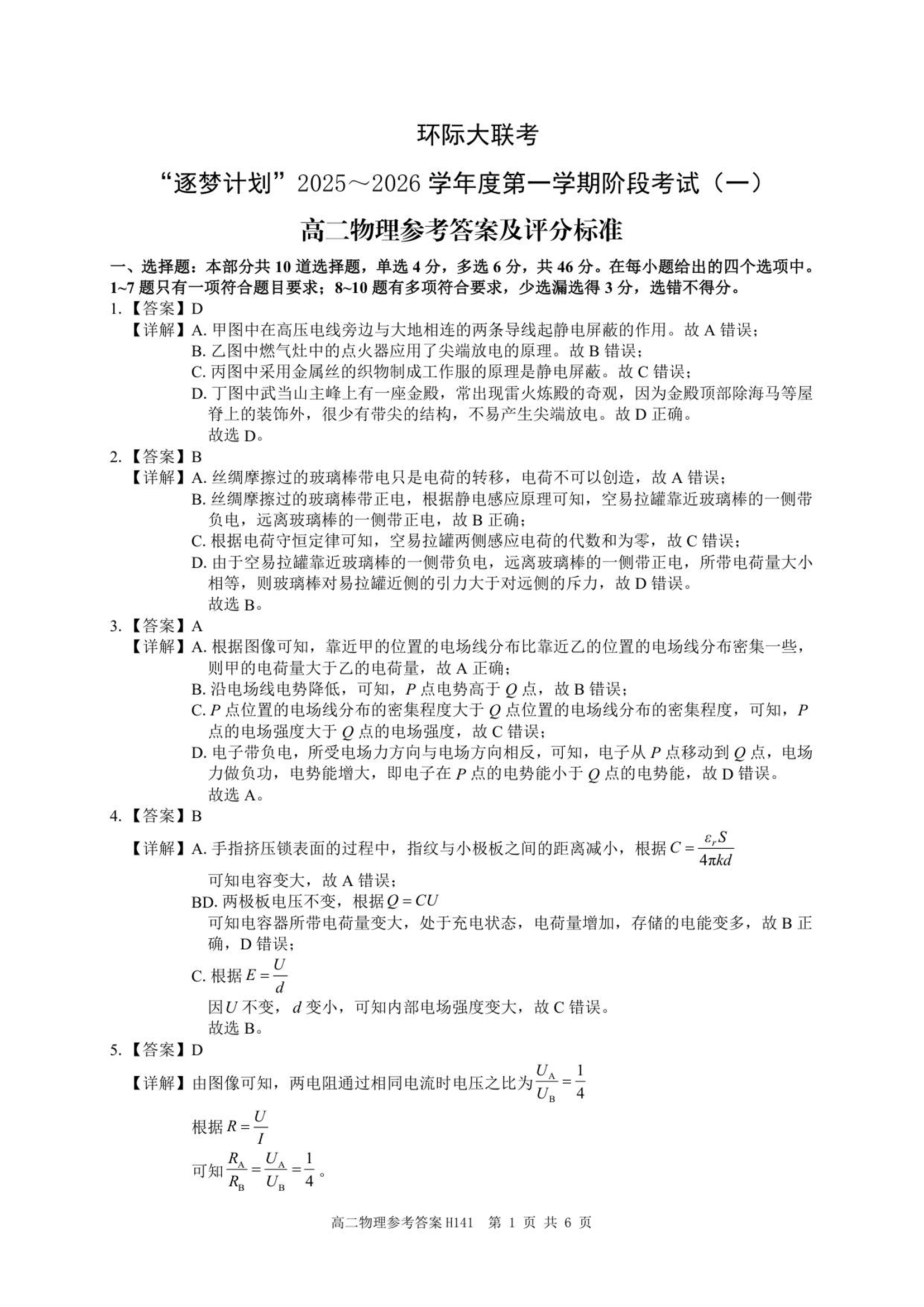 高二物理答案--河南省驻马店市“逐梦计划”环际大联考2025-2026学年高二上学期阶段考试(一)